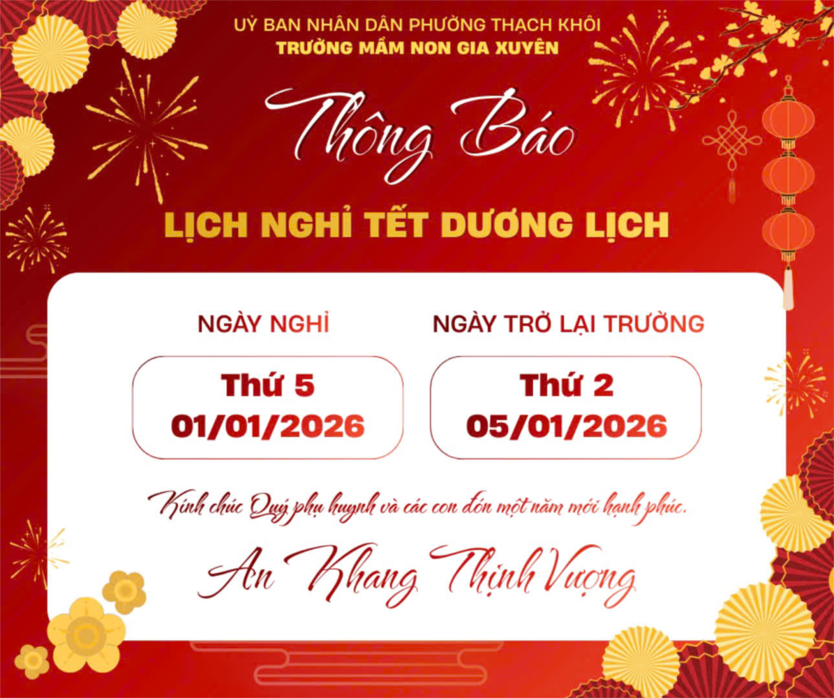 📘 Căn cứ Công văn số 380/TB-UBND ngày 26/12/2025 của UBND thành phố Hải Phòng, Trường Mầm non Gia Xuyên trân trọng thông tin tới Quý phụ huynh lịch nghỉ Tết Dương lịch của các con như sau: