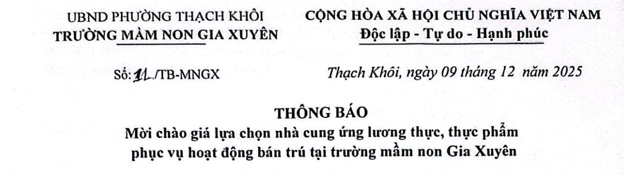 THÔNG BÁO: Mời chào giá lựa chọn nhà cung ứng lương thực, thực phẩm phục vụ hoạt động bán trú tại trường mầm non Gia Xuyên